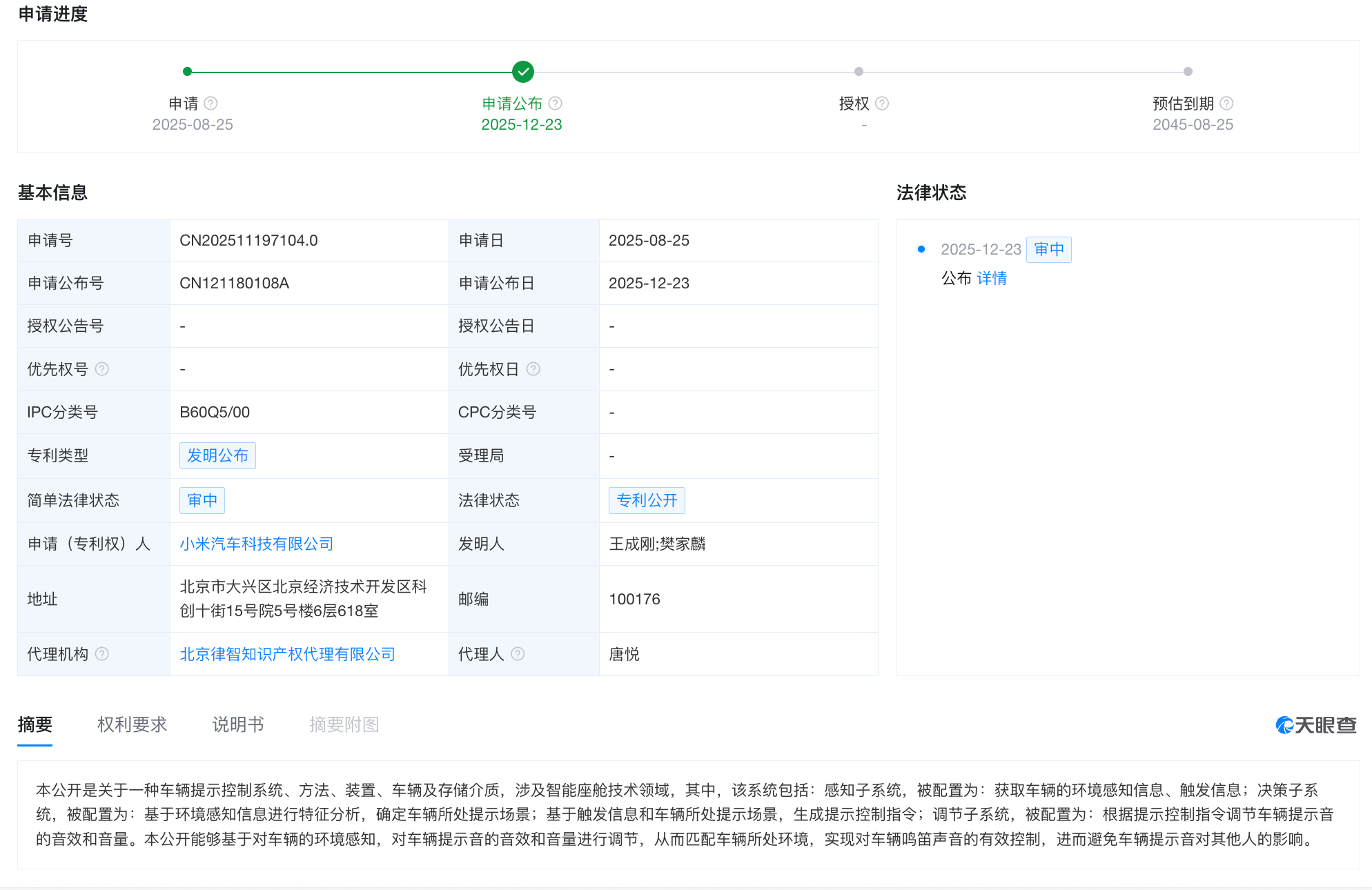 天眼查顯示,近日,小米汽車科技有限公司“車輛提示控制系統(tǒng)、方法、裝置、車輛及存儲(chǔ)介質(zhì)”專利公布。專利摘要顯示,該系統(tǒng)包括:感知子系統(tǒng),被配置為:獲取車輛的環(huán)境感知信息、觸發(fā)信息;決策子系統(tǒng),被配置為:基于環(huán)境感知信息進(jìn)行特征分析,確定車輛所處提示場(chǎng)景;基于觸發(fā)信息和車輛所處提示場(chǎng)景,生成提示控制指令;調(diào)節(jié)子系統(tǒng),被配置為:根據(jù)提示控制指令調(diào)節(jié)車輛提示音的音效和音量。