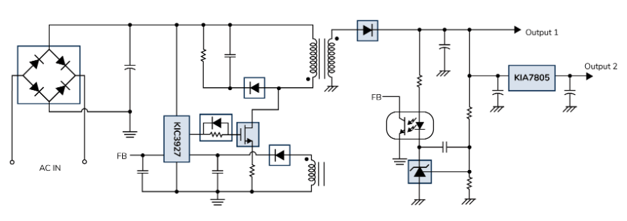 KIC3927是KEC旗下一款集成準諧振電流模式的PWM+PFM控制器,可用于非隔離反激式轉換器,通過創(chuàng)新的多模式控制策略突破性能瓶頸。該方案提供三級輸出:初級側輸出310V/0.5A用于電機驅動,次級側輸出12V/0.6A和5V/0.5A為MCU供電。