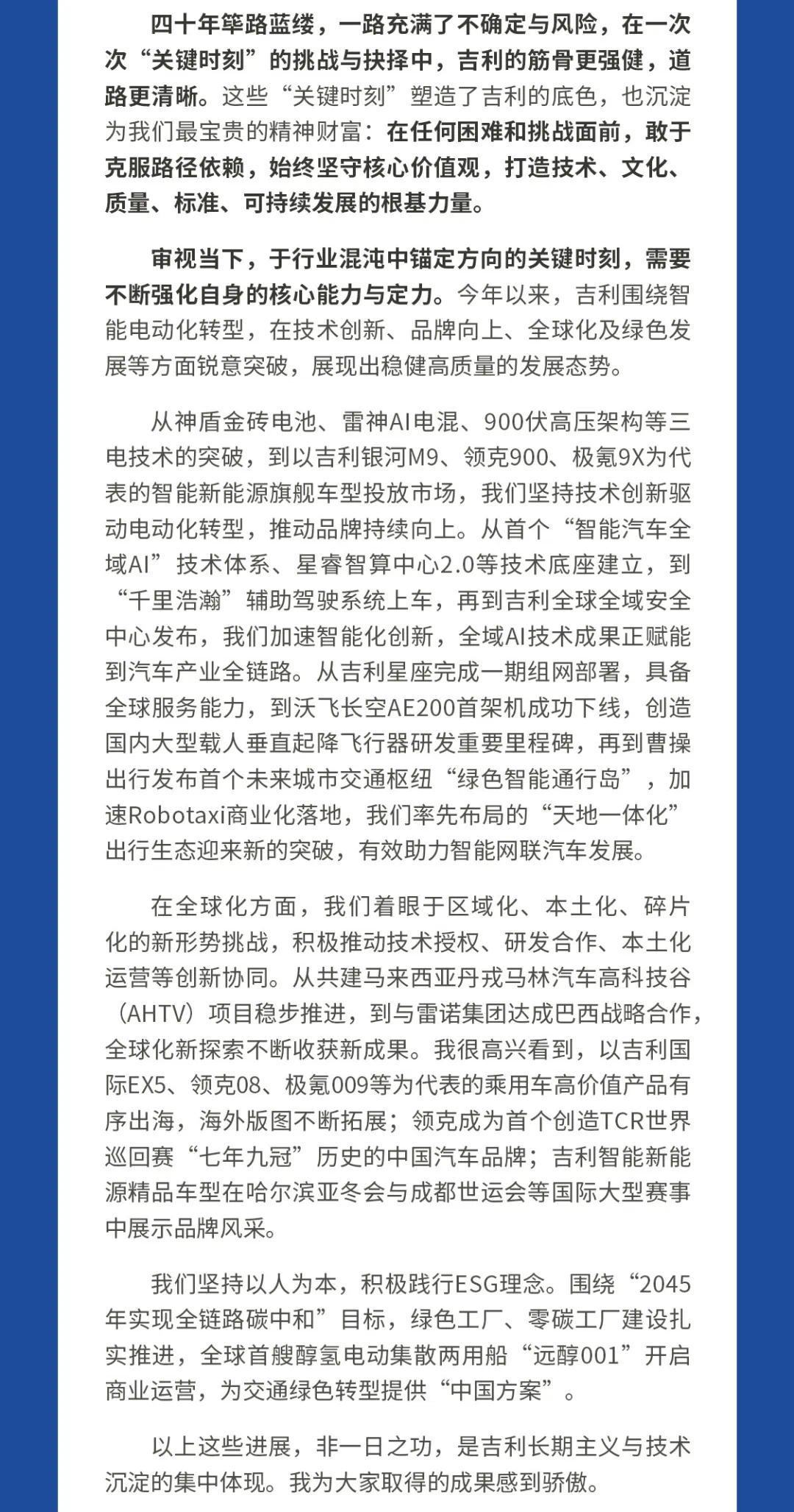 展望未來,李書福認為,無論技術、市場如何變革,以人為本的安全、綠色、愉悅的出行體驗始終是汽車產業不變的核心。為此,吉利將持續強化在技術創新、人才培養方面的投入。