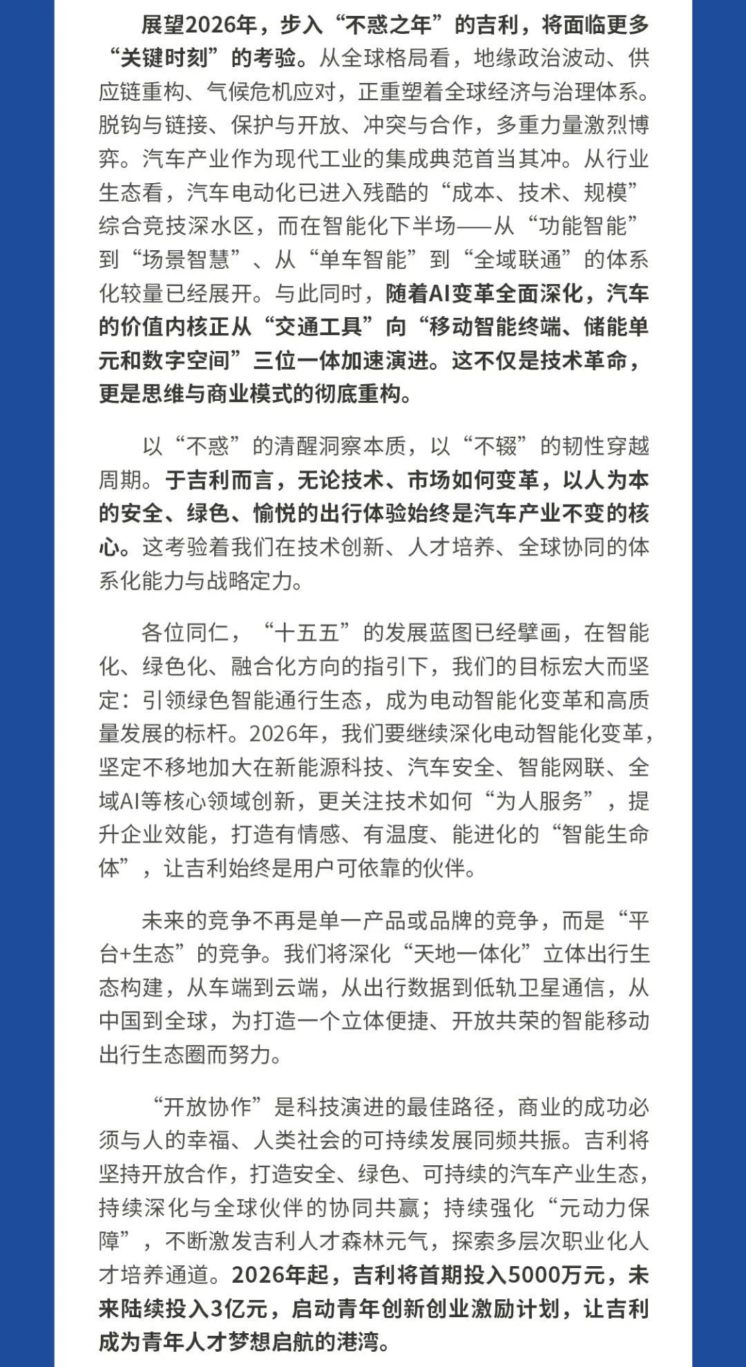 吉利李書福2026新年致辭:將投入3億元啟動青年創新創業激勵計劃