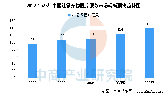 連鎖化是提升服務(wù)質(zhì)量、建立信任和降低成本的關(guān)鍵路徑。中商產(chǎn)業(yè)研究院發(fā)布的《2025-2030年中國(guó)寵物醫(yī)療市場(chǎng)深度研究及發(fā)展前景投資預(yù)測(cè)分析報(bào)告》顯示,2024年中國(guó)連鎖寵物醫(yī)療服務(wù)市場(chǎng)規(guī)模已達(dá)110億元,較上年增長(zhǎng)3.8%。盡管發(fā)展迅速,但相比海外成熟市場(chǎng),中國(guó)寵物醫(yī)療服務(wù)行業(yè)的連鎖化率仍有巨大提升空間,未來(lái)整合并購(gòu)將持續(xù)活躍。中商產(chǎn)業(yè)研究院分析師預(yù)測(cè),2025年中國(guó)連鎖寵物醫(yī)療服務(wù)市場(chǎng)規(guī)模將達(dá)到124億元,2026年市場(chǎng)規(guī)模將達(dá)到139億元。