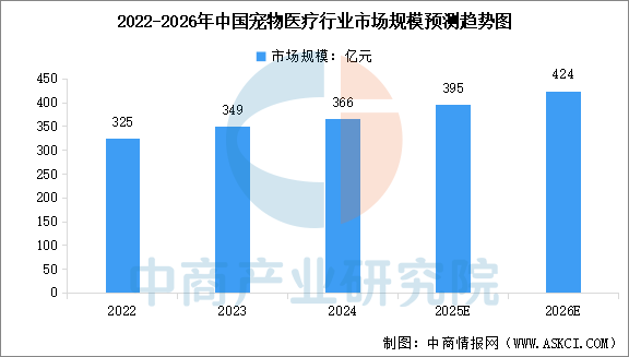 寵物醫(yī)療是寵物消費(fèi)市場(chǎng)中增長(zhǎng)穩(wěn)健的核心板塊。中商產(chǎn)業(yè)研究院發(fā)布的《2025-2030年中國(guó)寵物醫(yī)療市場(chǎng)深度研究及發(fā)展前景投資預(yù)測(cè)分析報(bào)告》顯示,中國(guó)寵物醫(yī)療行業(yè)市場(chǎng)規(guī)模從2022年的325億元增至2024年的366億元,期內(nèi)年均復(fù)合增長(zhǎng)率為6.12%。增長(zhǎng)動(dòng)力源于寵物數(shù)量增長(zhǎng)、老齡化加劇及健康消費(fèi)意識(shí)覺(jué)醒。中商產(chǎn)業(yè)研究院分析師預(yù)測(cè),2025年中國(guó)寵物醫(yī)療行業(yè)市場(chǎng)規(guī)模將達(dá)到395億元,2026年市場(chǎng)規(guī)模將達(dá)到424億元。