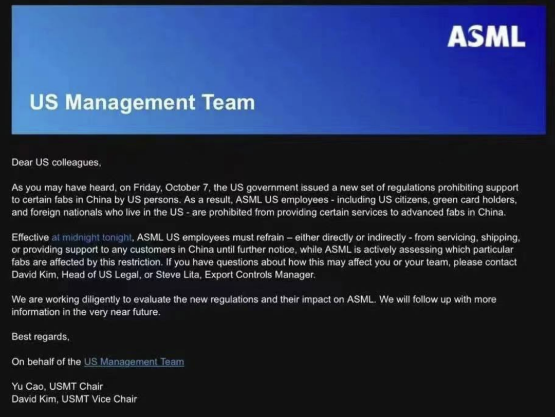 正如您可能已經(jīng)聽說的那樣,10月7日星期五,美國政府發(fā)布了一條新的法規(guī),禁止“美國人”向中國境內(nèi)的某些晶圓廠提供支持。因此,ASML的所有美國員工(包括美國公民、綠卡持有者、和居住在美國的外國人)被禁止向中國的先進晶圓廠提供服務(wù)。