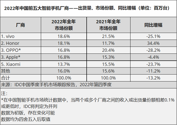 榮耀四季度位居第三位。2022年主要廠商中,只有榮耀實現(xiàn)同比增長,增幅達到34.4%,全年總出貨量上升到第二位。產(chǎn)品線布局的逐漸完善,幫助榮耀徹底恢復,經(jīng)過一年的快速增長,市場份額達到歷史新高。