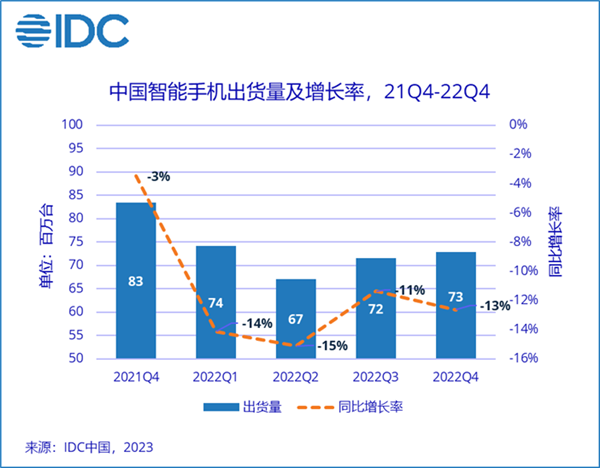 IDC中國發(fā)布的手機季度跟蹤報告顯示,2022年第四季度,中國智能手機市場出貨量約7,292萬臺,同比下降12.6%。