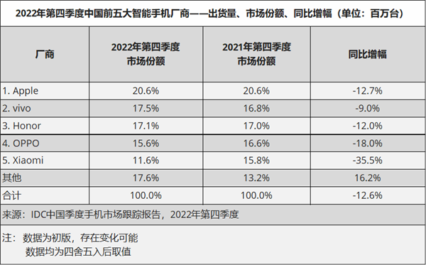 第四季度,蘋果、vivo、榮耀、OPPO、小米前五大廠商無一例外的遭遇出貨量大跌,跌幅從9%-35.5%不等,一片哀鴻。